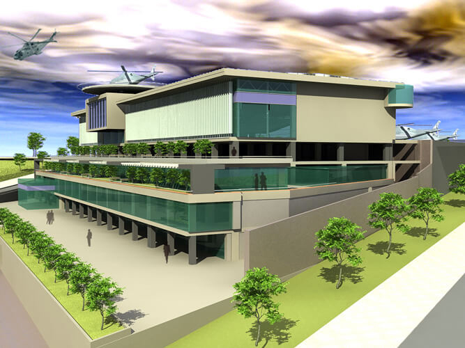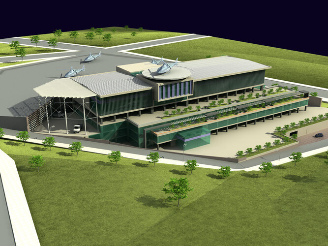 Yapı 11 bloktan oluşmaktadır; Apron’un yanı sıra firmanın idari merkezi, çok amaçlı ofis ve mağaza katları ile otopark alanları mevcuttur. Vadiye oturan Betonarme karkas üzerinde bir de çelik konstrüksiyon olarak projelendirilmiş helikopter bakım-tamir hangarı bulunmaktadır. Zemin Altyapı, Betonarme karkas ve Çelik Konstrüksiyon Projeleri firmamız tarafından tamamlanmıştır.